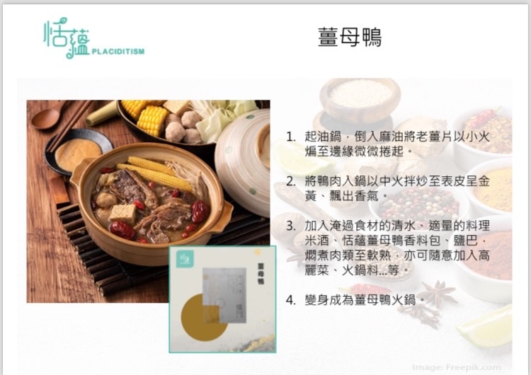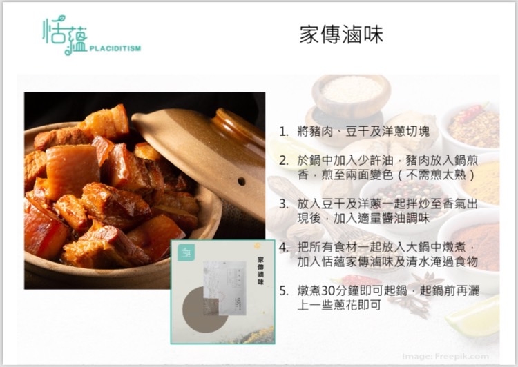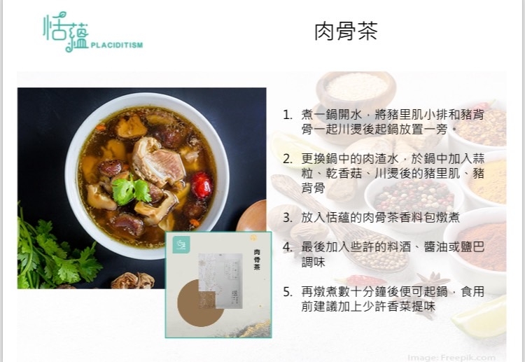 在歲月更迭下,第四代於民國110年沿續初心成立「恬蘊Placiditism」品牌,期待 以恬靜、悠閒的意象融合傳統質樸、悠久歷史及深厚底蘊的中藥形象,加入新巧 思,賦予品牌更多的可能性,除了傳承自堅持古法製造的優質藥膳,更針對追求 快速的現代社會,推出方便、美觀、又易保存的養生茶包飲品、料理香料包、燉 補藥膳包...等。
