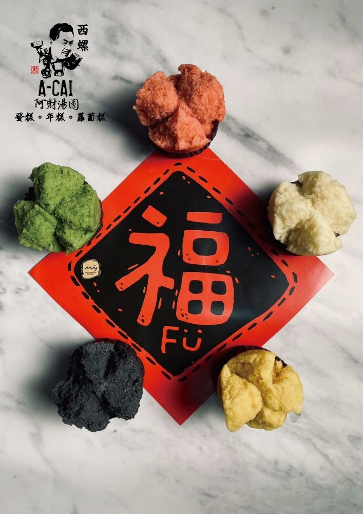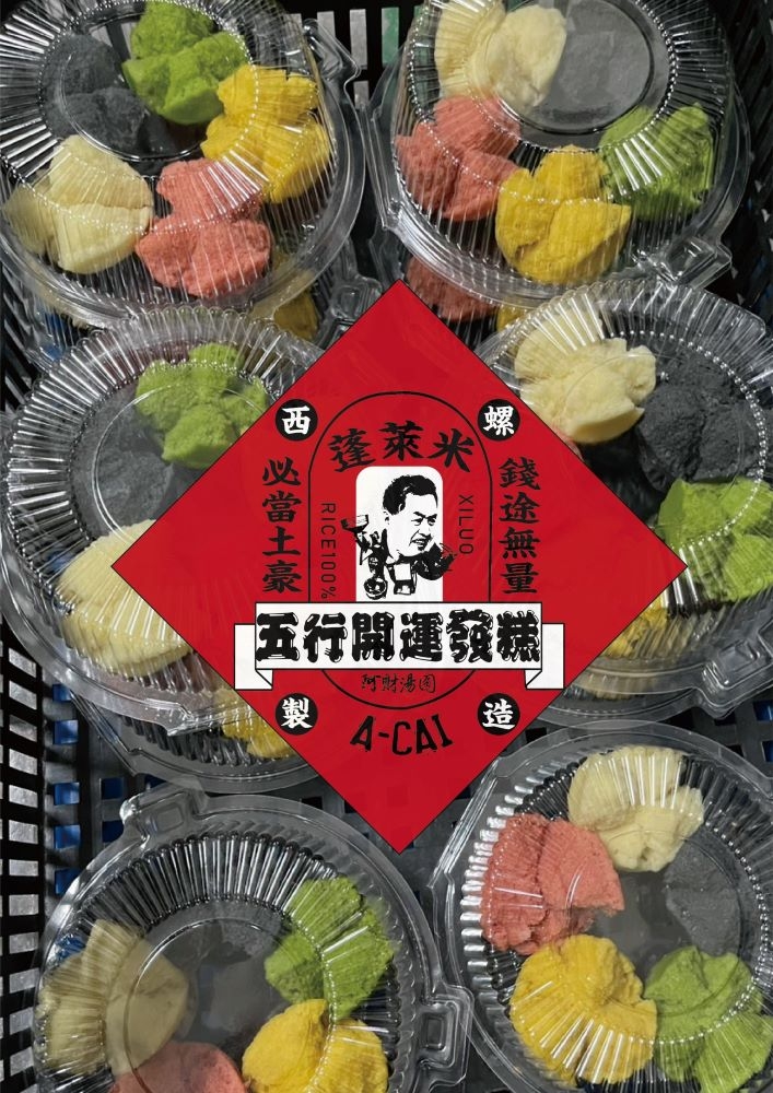 發糕,閩南語唸作發粿。傳統上認為糕點頂端有裂開的樣子,是會發財、發達的好兆頭,製作時外型發得越大、裂縫越深,象徵新的一年運勢好發大財。五行發糕打造補運的磁場, 亦運用「五行法則」做為開運, 讓身心靈更加平衡。「原味、紅麴、南瓜、抹茶、竹炭」, 五種色彩也能在過節中感受繽紛與歡樂的喜氣。