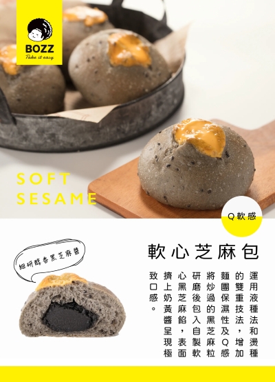 ▶成分:法國麵粉、奶油、砂糖、岩鹽、酵母、糖粉、黑芝麻粉、黑芝麻粒、玉米粉、乳酪、鹹蛋黃
